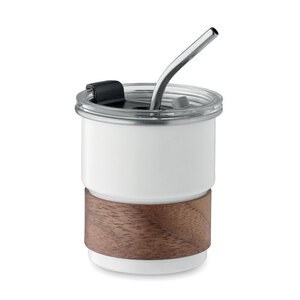 Enkelväggig kopp i återvunnet rostfritt stål (90% återvunnet rostfritt stål och 10% rostfritt stål) med avtagbart grepp i akaciaträ, sugrör i rostfritt stål.