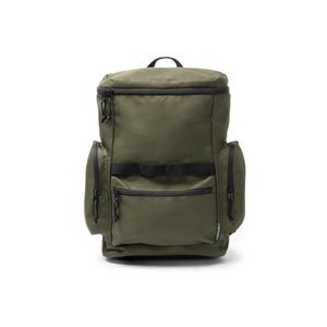 Features exterior side and front pockets with zip closures and black zip pulls.
