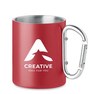 Dubbelväggig mugg i rostfritt stål, med karbinhandtag.